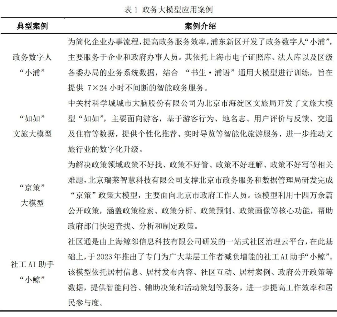 为了深入了解政务大模型在不同场景中的应用情况,研究团队于2024年6月至9月先后调研、访谈了上海浦东政务服务局、北京市政务服务和数据管理局等政务部门主要负责人,以及上海鲸邻信息科技有限公司、中关村科学城城市大脑股份有限公司等企业技术主要负责人。最终选定数字人“小浦”、“如如”文旅大模型、“京策”大模型、社工AI助手“小鲸”四个典型案例为研究对象(参见表1)。选择的依据如下:一是案例的典型性,每个案例均为所在领域的代表性实践,具有可复制的经验与创新价值。二是案例的代表性,涵盖了政务服务、政务办公、社会服务和管理决策四大政府核心职能领域,能够全面反映政务大模型在不同治理场景中的功能定位。三是案例的充分性,所选取的案例资料可获得性较高且详实,确保数据验证的可靠性。
