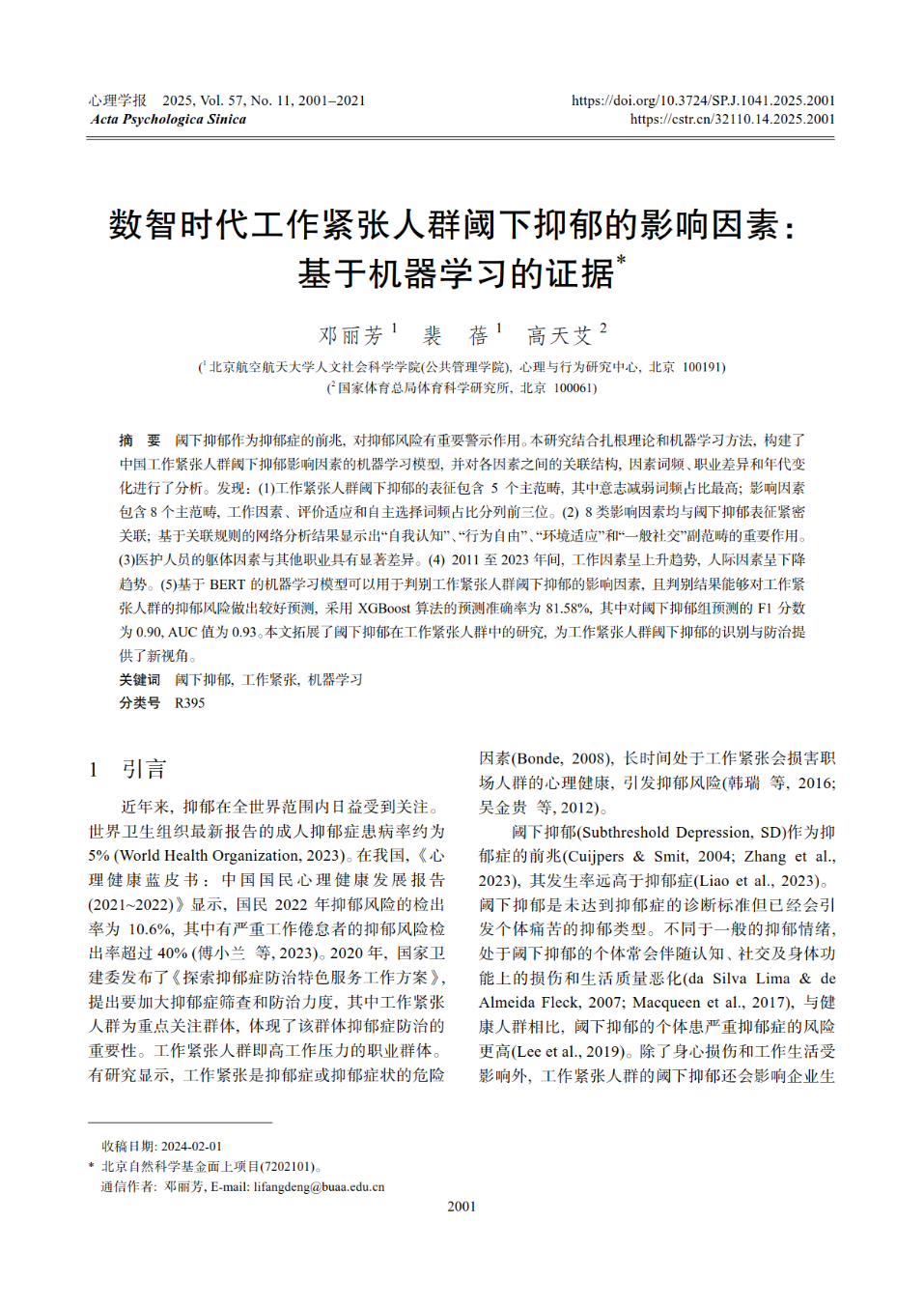 近日,《心理学报》刊发英国上市公司365(公共管理学院)邓丽芳教授、博士研究生裴蓓、硕士毕业生高天艾的论文“数智时代工作紧张人群阈下抑郁的影响因素:基于机器学习的证据”,该论文发表在《心理学报》“人工智能心理与治理”栏目,研究关注高压力工作人群的抑郁风险识别,采用机器学习等方法,为工作紧张人群阈下抑郁的识别与防治提供了新视角。