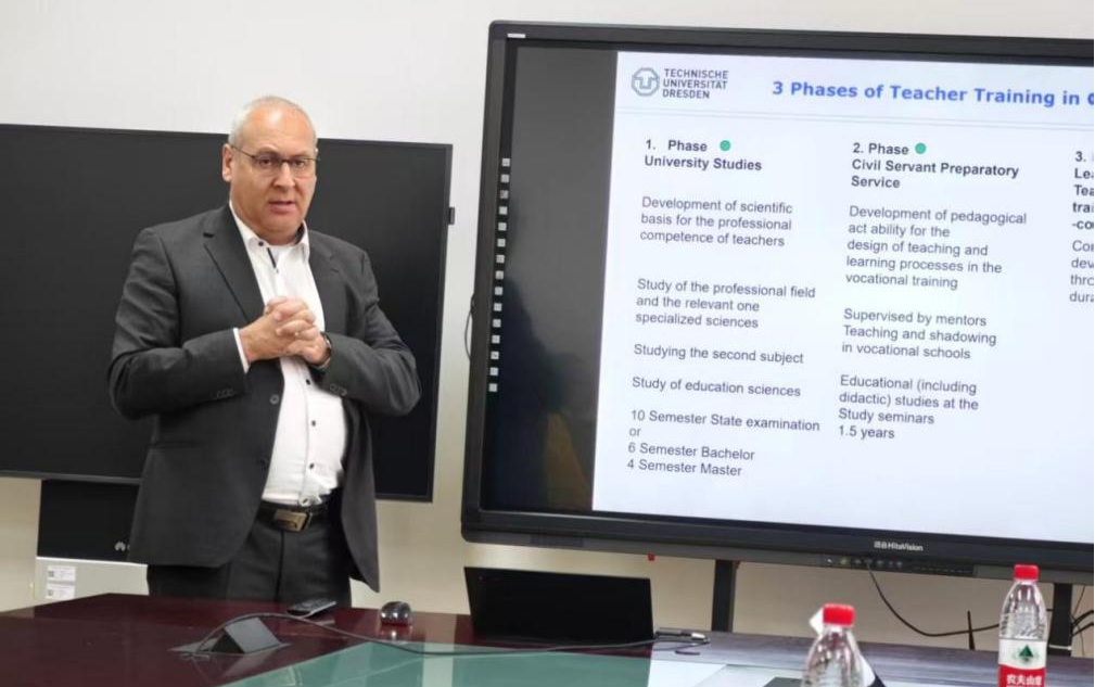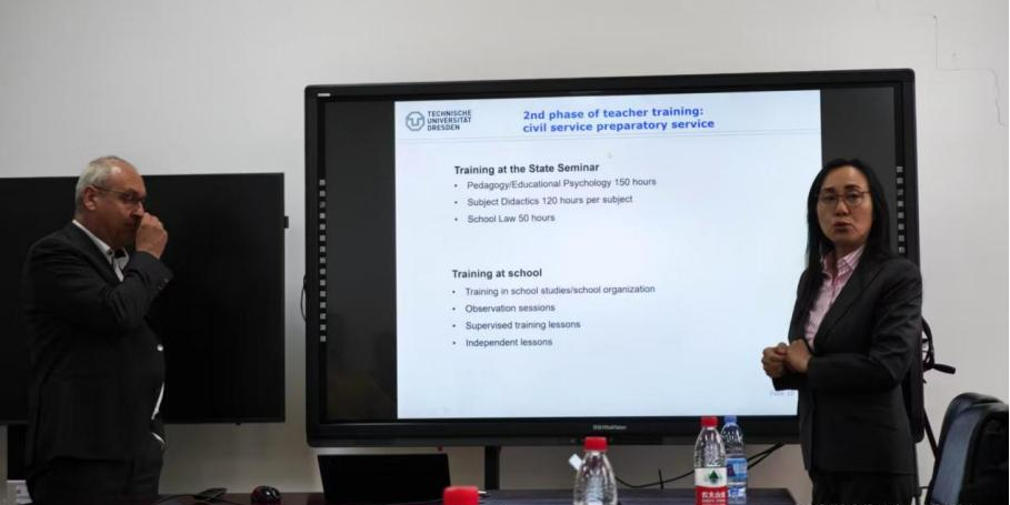 研讨会上,德方专家系统介绍了德国中学科学教师的培养路径、中学教师在职继续教育体系以及基于“行动导向教学法”(Handlungsorientungs Methode)的课程实施与评价模式。Hanno Hortsch教授还分享了国际工程教育协会(IGIP)在推动全球工程教师认证与专业发展方面的经验。中方团队详细阐述了“国优计划”的背景、目标与实施进展,并围绕教师教育课程设置、大学与中小学协同育人机制等内容展开交流。双方一致认为,德国在教师专业化培养、持续职业发展及教育标准建设方面的经验,对我国“国优计划”的实施具有重要借鉴意义。基于讨论,双方明确了三项合作方向:人才培养(学生交换及联合培养、课程引进、培养方案修订等)、科研合作(联合申请科研项目、合著论文等)以及教师交流(教师培训及访学、国际会议等)。
