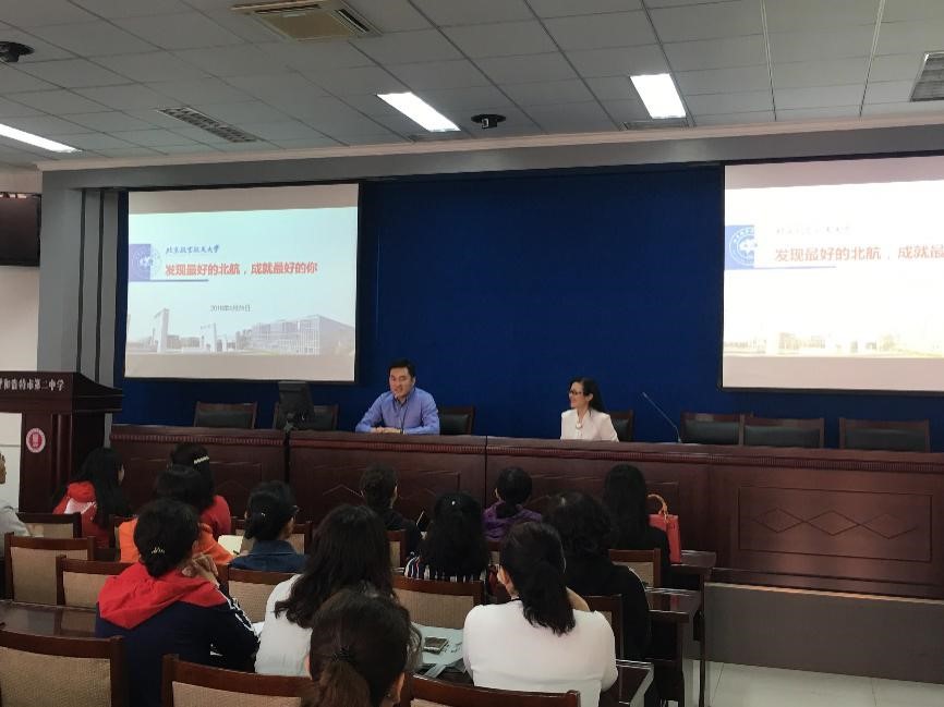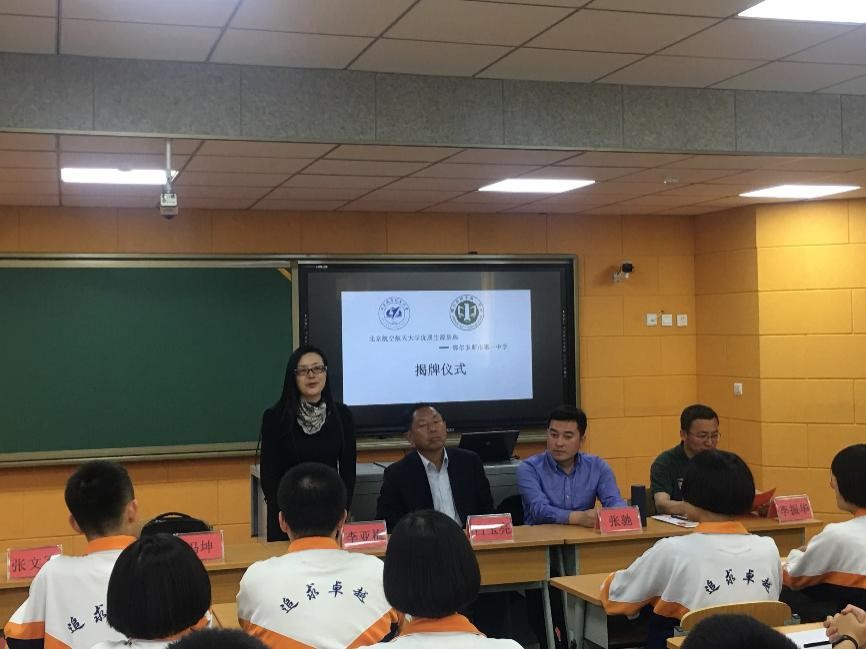 26日上午,招生组前往鄂尔多斯一中。在李振华副校长的带领下参观了学校并重点向我们介绍了实验楼。下午,举行揭牌仪式。李亚梅老师表达了对高二同学的殷切希望。李振华副校长作为校方代表表达了对北航的感谢,并从发展历史、学风建设、学科专业等方面向同学们介绍了北航。张驰老师深入浅出,以同学们喜闻乐见的小故事进行宣讲,展现了北航的风采魅力。揭牌仪式后,招生组三人与白玉亮校长展开交流。