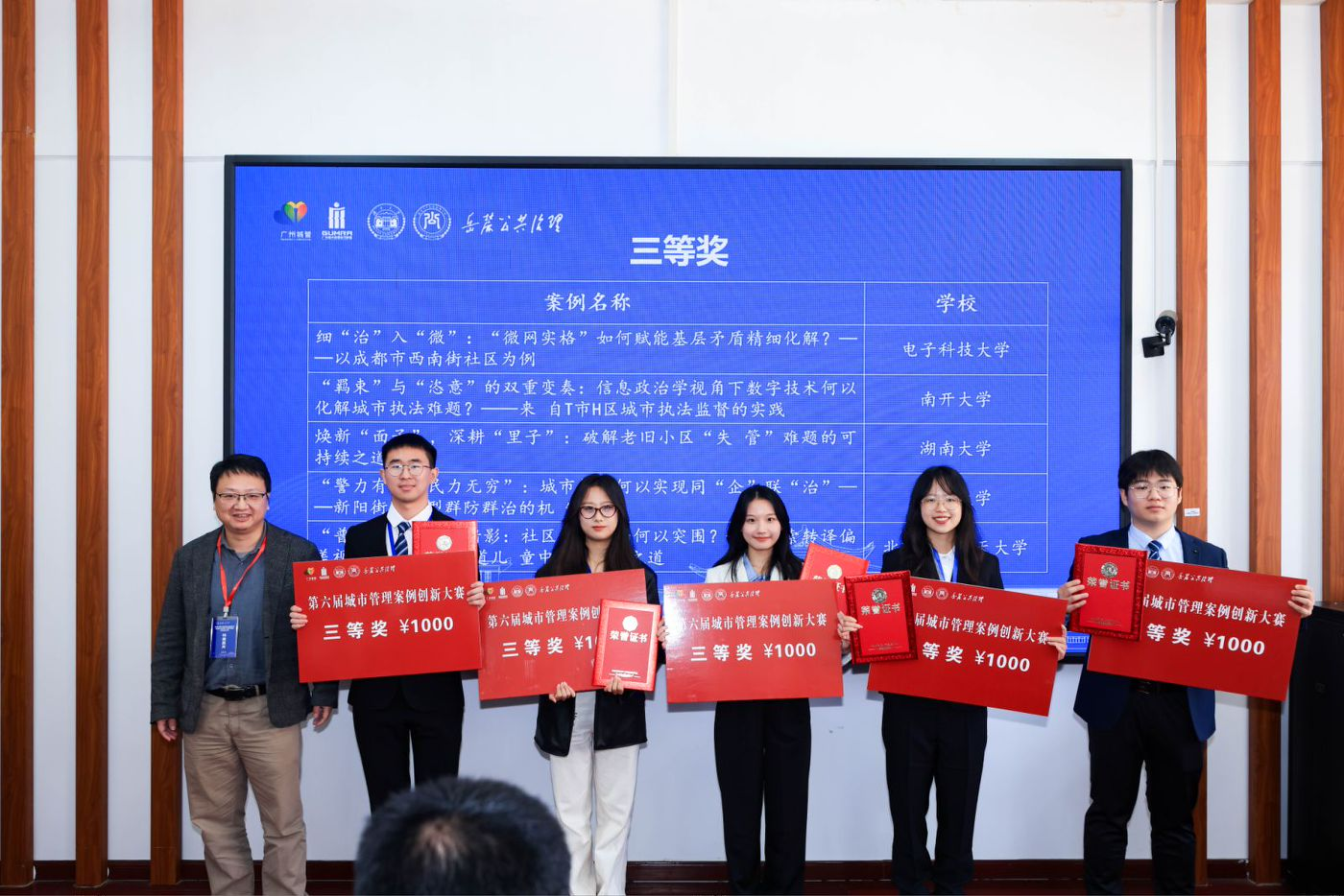 近日,我院行政管理专业本科生队伍“未来守护者队”(队员:郭睿、朱琳、李婧然、黄一凝、史孟娅,指导教师:陈文博、刘亚娜)在湖南长沙举行的超特大城市治理现代化的理论与实践研讨会暨第六届城市管理案例创新大赛中,经过初审选拔和决赛的激烈竞争,最终在总决赛现场的18支队伍中脱颖而出,荣获三等奖,充分展示了我院学子对中国城市现状问题的关切,凸显了我院学生将公共管理理论知识有效转化为解决现实问题的能力。